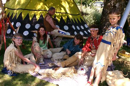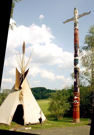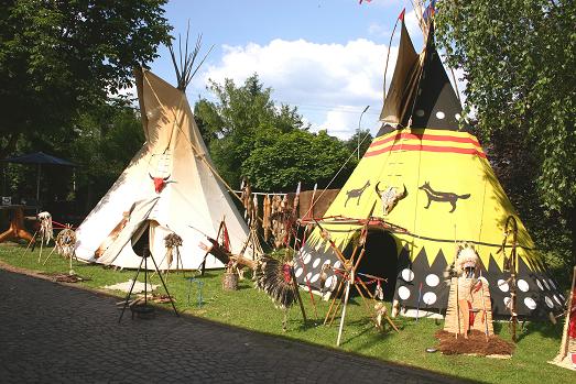 Insgesamt 3 Gruppen von Indianerdarstellern hatten vor dem Haupthaus des Hofes ihre Teepees aufgebaut, und präsentierten eine phantastische Vielfalt an authentischen Werkzeugen und Waffen.