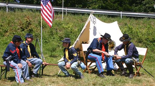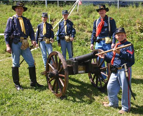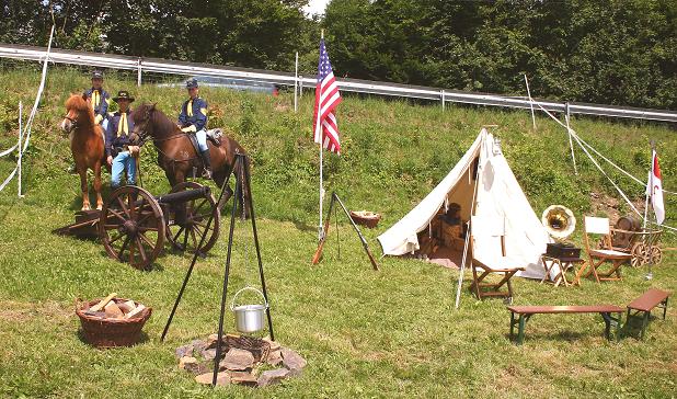 Hinter dem Hof hatte eine Einheit der US-Kavallerie Stellung bezogen. Die American 19th Century Reenactors Büschergrund hatten mit ihren Pferden, sowie dem von den Sportschützen Freudenberg freundlicher Weise zur Verfügung gestellten leichten Feldgeschütz ein kleines Feldlager aufgebaut.
